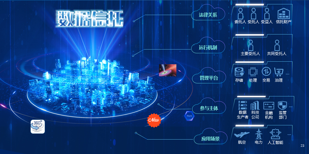 2023年6月,国家金融监督管理总局(原银保监会)下发的《关于规范信托公司信托业务分类的通知》正式实施,其中明确规定信托公司应当以信托目的、信托成立方式、信托财产管理内容作为分类维度,将信托业务分为三大类:资产服务信托、资产管理信托、公益/慈善信托。在资产服务信托大类中可以明确的找到“新型资产服务信托”这一主要信托业务品种,而数据资产作为一种新型资产,在监管部门批准下有望成为该类服务信托的创新细分类型;当数据资产经过公允定价成为金融产品时,作为投融资标的数据信托业务又可以进入资产管理信托的范畴;当把数据资产产生的收益用于公益慈善目的时,理论上数据信托也可以由公益慈善信托的业务范畴。由此可见,数据信托具有广阔的业务前景。